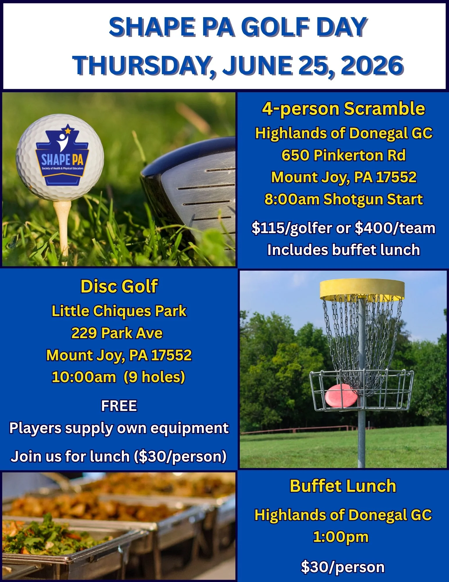 Join SHAPE PA for a day of golf, disc golf, and networking on Thursday, June 25, 2026, in Mount Joy, PA. Whether you’re hitting the links or the disc course, this event offers fun, connection, and support for health and physical education across Pennsylvania.
